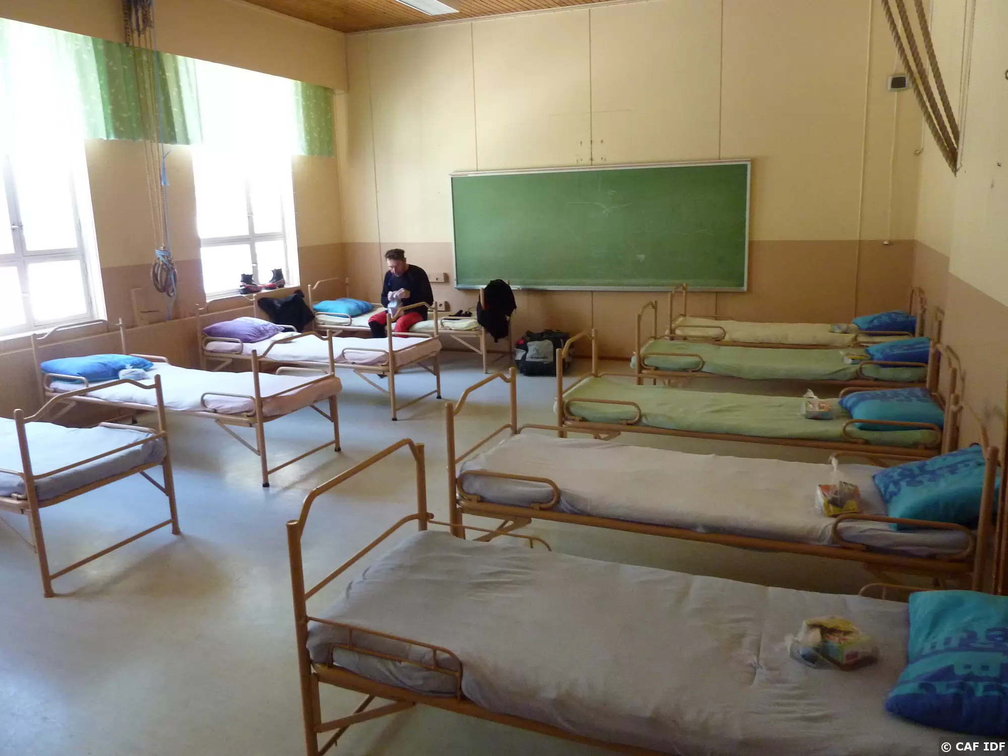 écoles. Les matelas sont alignés dans la salle de classe et nos