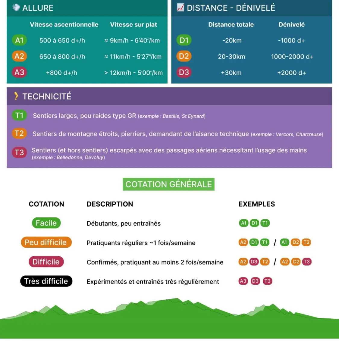 Afin d’évaluer la difficulté d’un trail, la distance ne suffit pas : le dénivelé doit aussi être pris en compte. Ainsi, l’unité de mesure d’un trail est l’ “équivalent kilomètre”. Celui-ci est égal à la somme du nombre de kilomètres du trail ainsi que du dénivelé positif (en centaines de mètres). Ainsi, la difficulté d’un trail en boucle de 65km et d’un dénivelé positif de 3500m (donc également 3500m de descente) est égale à 65km + 3500m D+/100 = 100 équivalent kilomètre.
